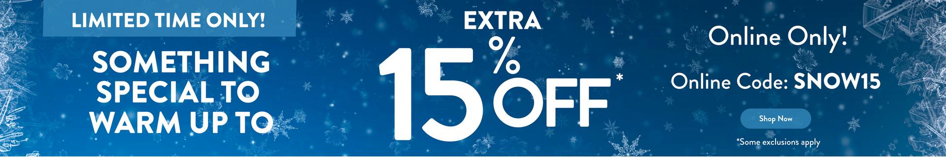 Cold got you down? Stay toasty and save online with an extra 15% off for a limited time!